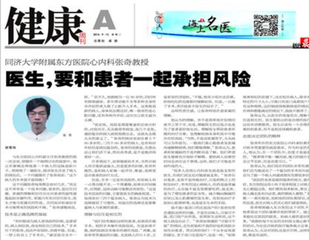 名医专访 | 东方医院心内科张奇:医生,要和患者一起承担风险 2016-09-18 胡雪玮
